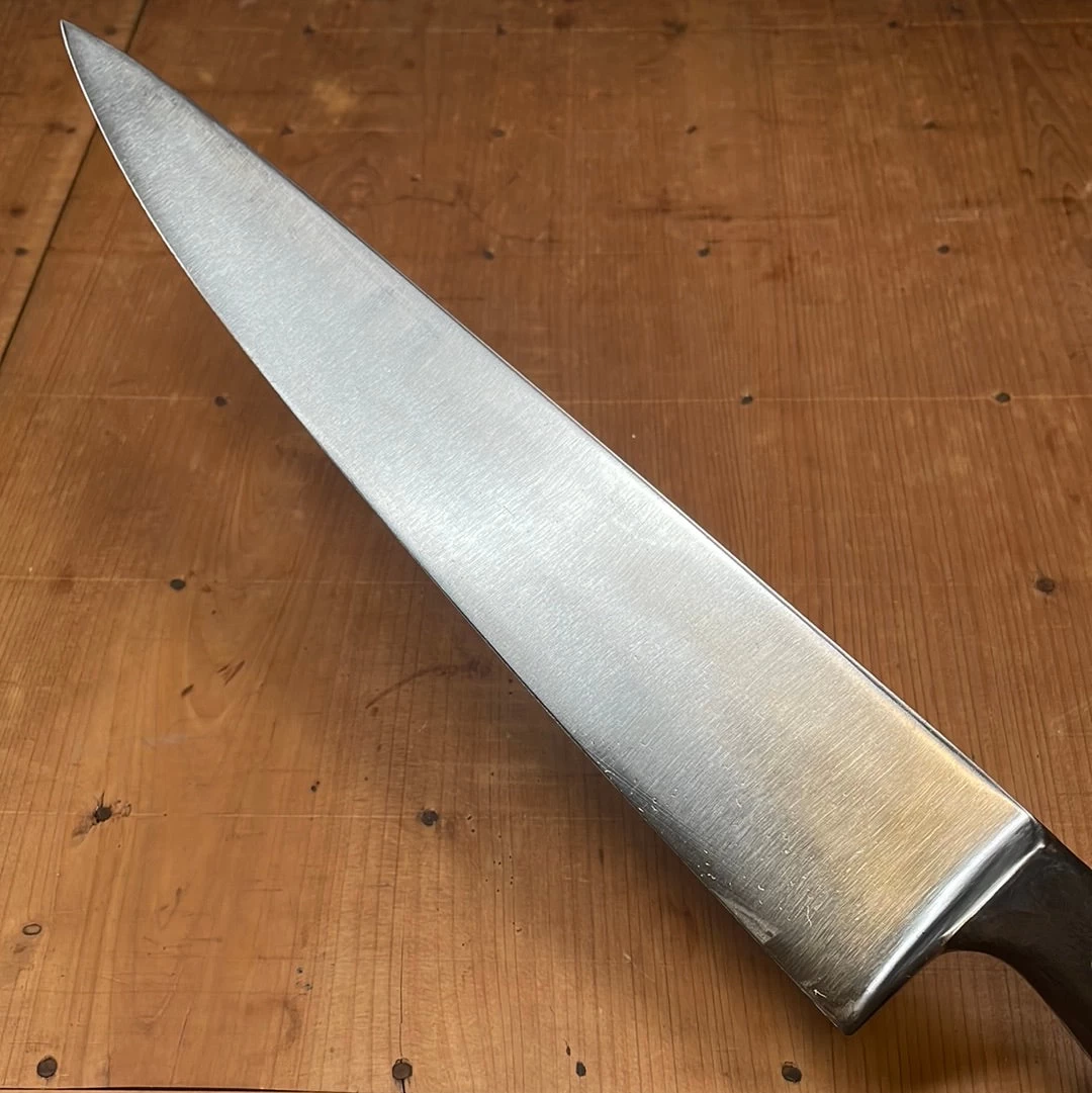 Drop forged and then hand forged (tapered tang, lots of taper in blade thickness) hand ground (and hand ground again) German chef knife from approximately the 1950’s (or early 60’s) judging from the forged tapered tang and pin and disc rivets but and very much still the norm then; solid wood handle scales. Hand forged and ground carbon steel knives like this largely ended in the mid 1960’s in Solingen Germany being supplanted first by the removal of hand forging after drop forging and later by stainless steel and less hand grinding. As the older skilled workers retired and the cost of labor rose hand grinding on carbon steel was no longer the norm in Solingen. Stainless steel became very popular and the bigger names in Solingen began to produce larger quantities of knives with less hand work in the 1970’s onward. This knife represents a previous era where hand work was a pillar of Solingen production.Â