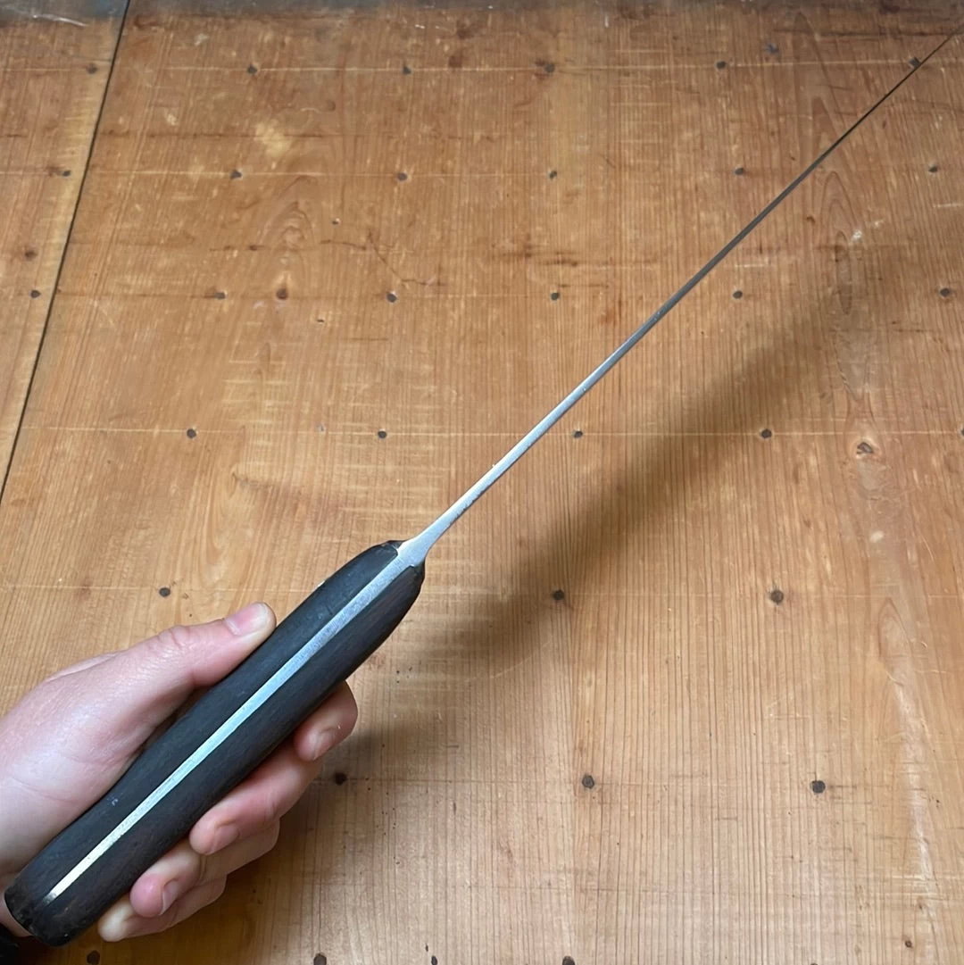 This knife will work great for large ingredients like melons, large batches of veggies or as a slicer for boneless meat. Large chef knives like this were often used to prepare a roulade; a thin sheet of meat cut from a larger tougher section that was rolled up and trussed with different ingredients, there are old French or German recipies, see our book Sharp to see chef Chris Kronner’s take on this classic.