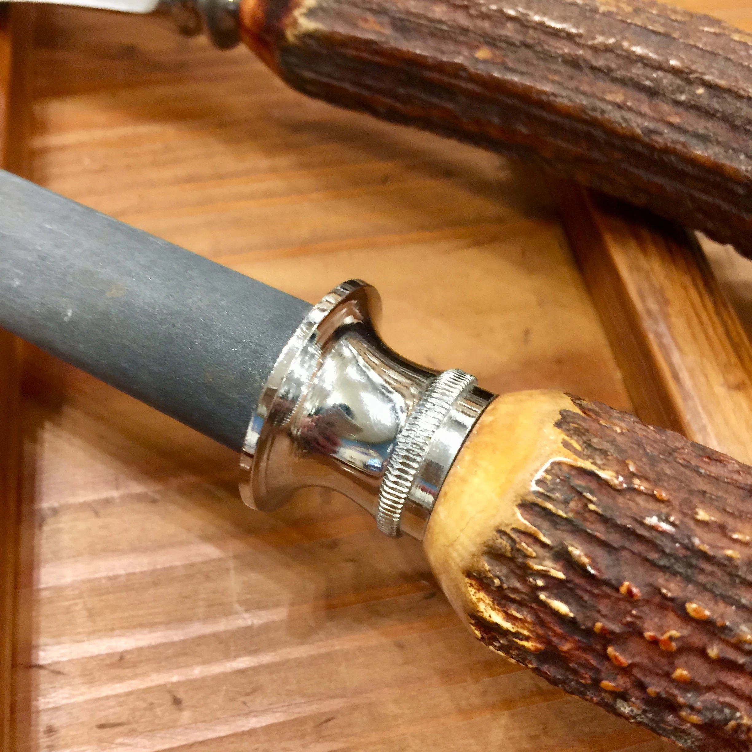 Vintage Harrods Carving Set Carbon Steel Blade, Stainless Fork Carborundum Honing Rod C 1930’s-50’s