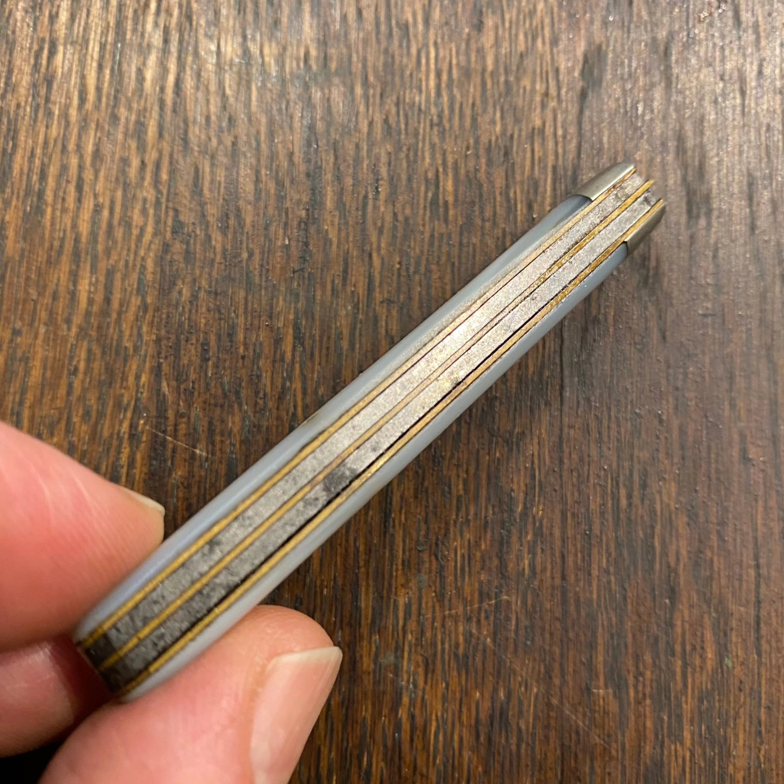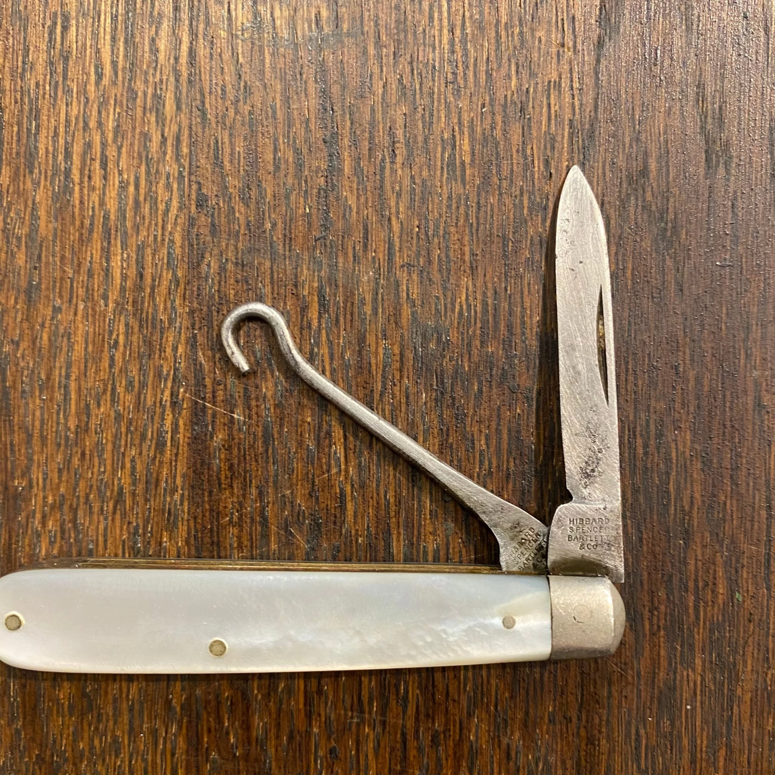 Antique Hibbard Spencer & Bartlett pen knife with button hook and mother of pearl scales. A relic of a long gone tight laced fashion and the utensils it necessitated, I think the button hook suggests 1920’s-30’s. HSB operated over a long stretch of time, the sans serif logo on the stamp suggests 20’s-30’s age and not older, but this is a guess.