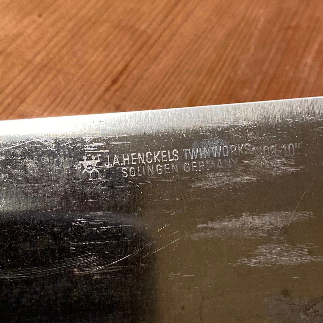 J. A. Henckels 108-10” chef knife made in the end of their production of solid wood handled carbon steel; hand ground after initial drop forging (no secondary hand forging on this era) with riveted European walnut handle. Likely 1960’s possibly early 70’s. Definitly at the end of the era of old style Solingen hand ground carbon steel Henckels.