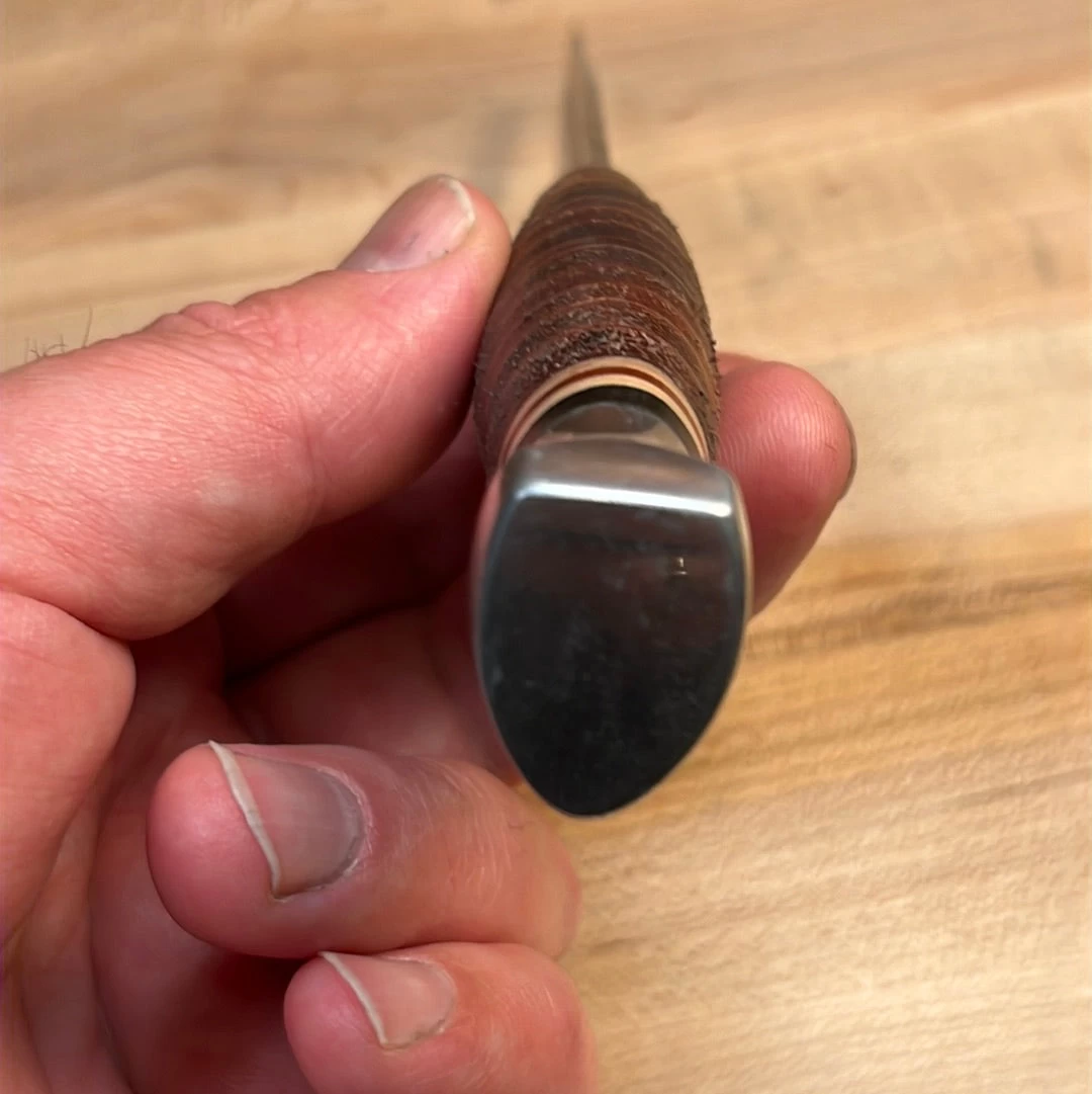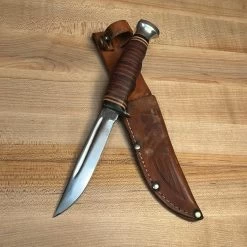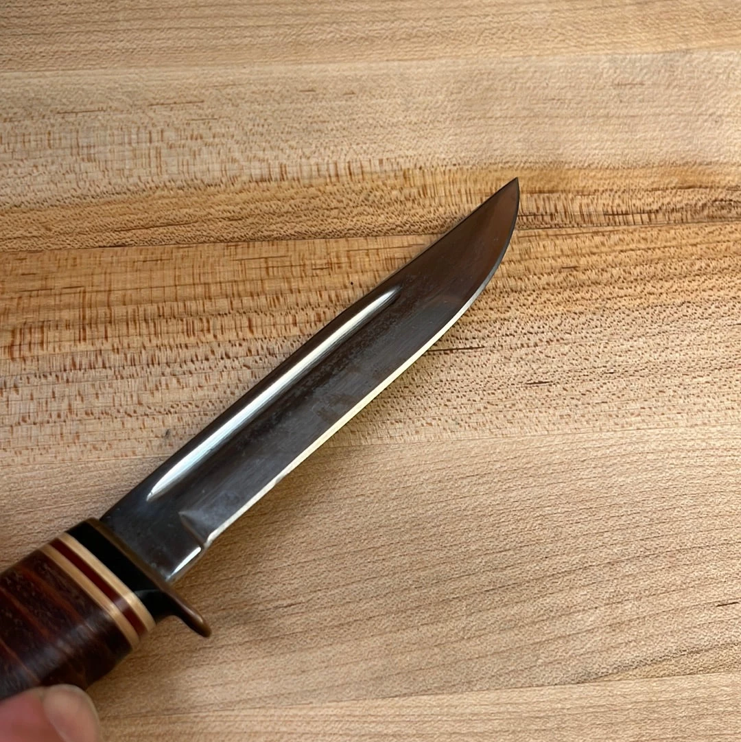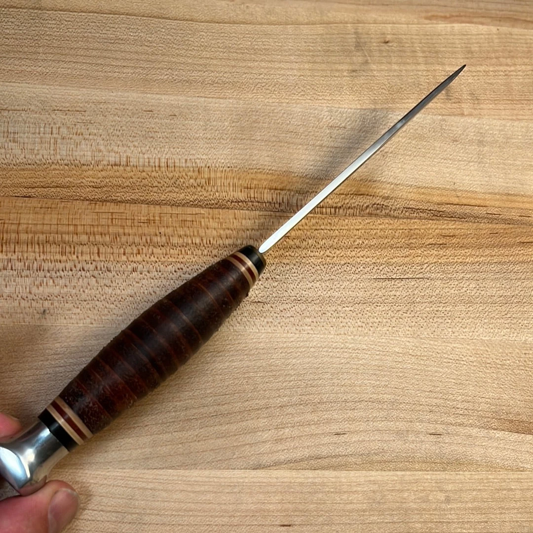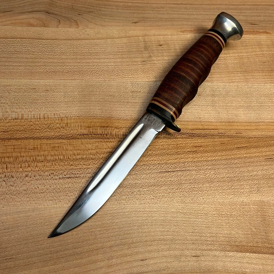 Vintage Kabar (spelled Kabar and not Ka Bar = 1966-96) carbon steel bird and trout fixed blade knife with carbon steel blade, stacked leather handle and aluminum pommel with leather sheath.