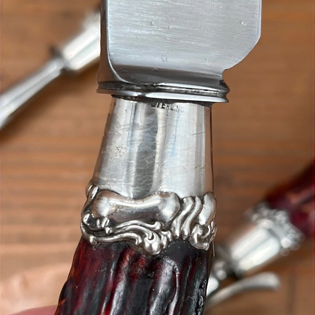 3 piece carving set made with carbon steel, sterling silver ferrules and stag grips. This set was made by Landers Frary at their Aetna works factory in New Britain Ct. At one point LF&C was one of the largest knife making outfits in the USA and was a huge kitchen equipment maker as well.