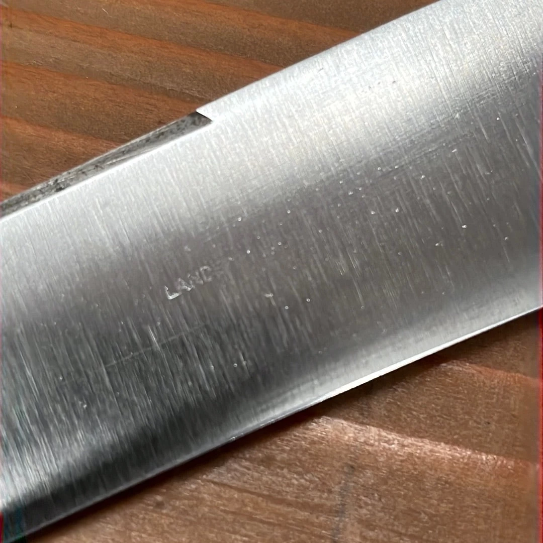 This knife has been re-ground and thinned behind the edge on a large 3 foot diameter Japanese water stone wheel (kaiten mizu toishi) and then resurfaced with a medium fine finish, our take on an old style grinding and finishing technique. While the particular wheel used to refurbish this knife is typically used in Japanese knife making it is very similar to the old grinding wheels used to shape European and American hand ground cutlery. A convex face to a blade greatly increases a knife’s performance as there is less sticking as there is on a flat face and the blade does not get thick behind the edge nearly as fast as with a flat faced blade. Being that we are often working with old blades that need re-shaping and might have been rusted expect some minor imperfections, we try to give a fresh start to our re-ground blades with an eye towards their original grind style and keeping as much metal is needed on a blade when ever possible. Check out Bernal Cutlery co founder Josh Donald’s book Sharp to see these wheels in use and more about their history in Europe and Japan.