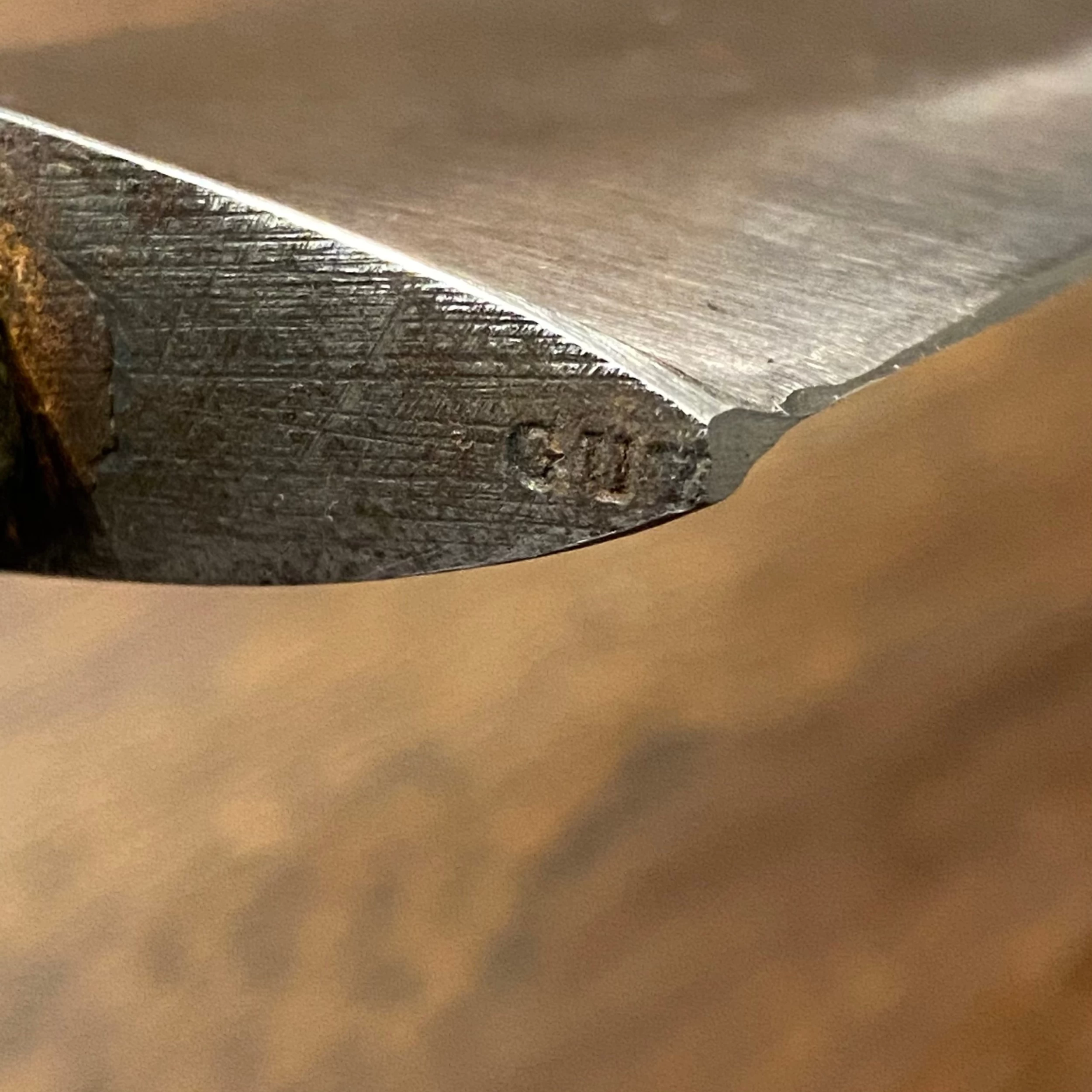 Antique chef knife marked M Schlesinger Berlin C., Rosenthaler Str 63-84 (?) and GF inside an oval. These markings have no references that I can find and I suspect that M Schlesinger was a retailer and GF is the maker. Inside the heel is the mark “Guy..” which is most likely the G in GF. The style of forging and the style of the mark GF, Guy and the name Guy suggest French manufacture rather than German. German knife makers certainly made these rat tail tang AKA ‘Nogent’ style knives.