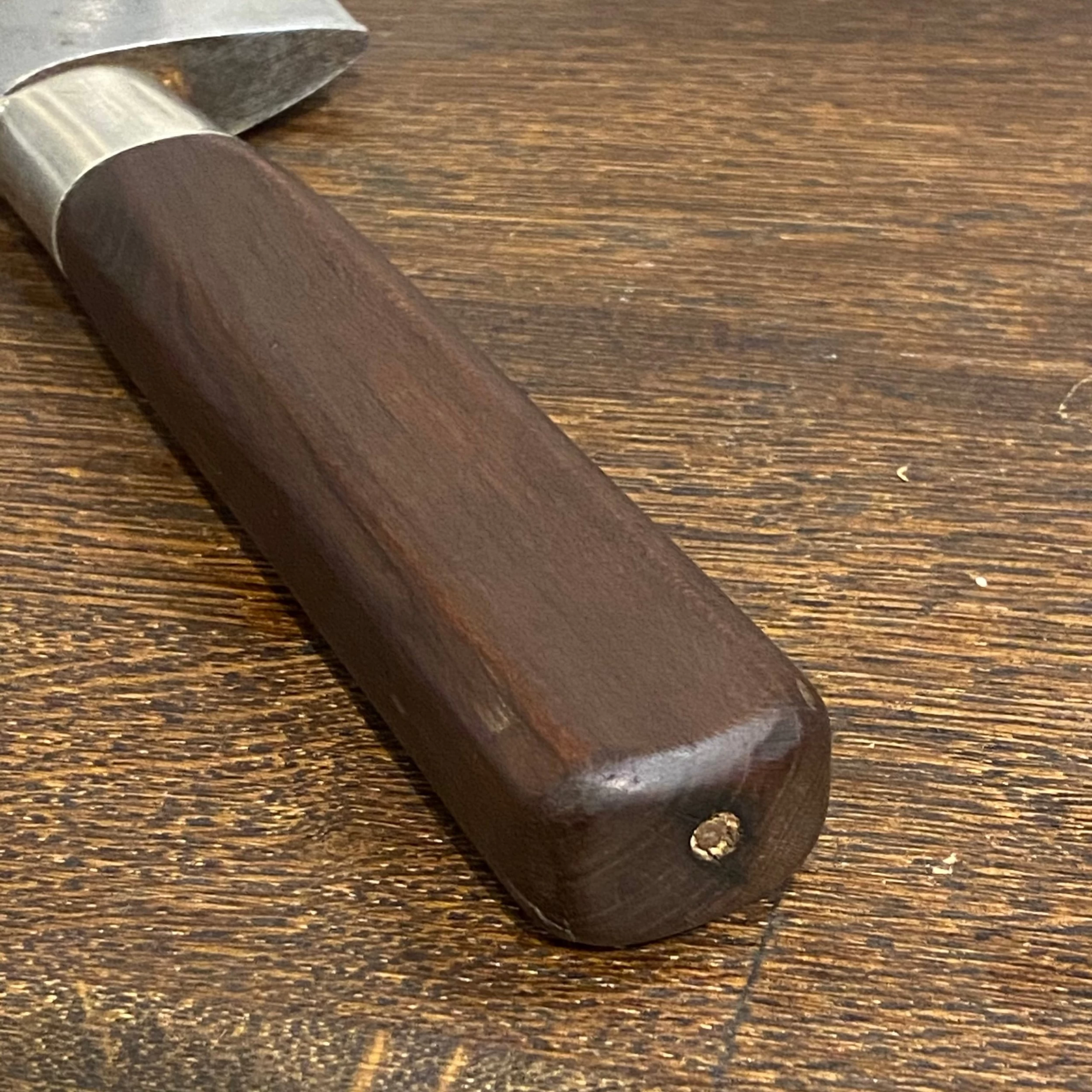 Blade is a hand forged carbon steel with a thick spine and heel and a thin graceful tip half. It has been sharpened down a lot and is much narrower than original, it might have been originally 2.5” wide and is now 1.75” wide at the heel. The handle looks to have been replaced a long time ago as well. The original handle had a birds beak pommel rather than the straight handle it has now, the nickel ferrule ring is original.