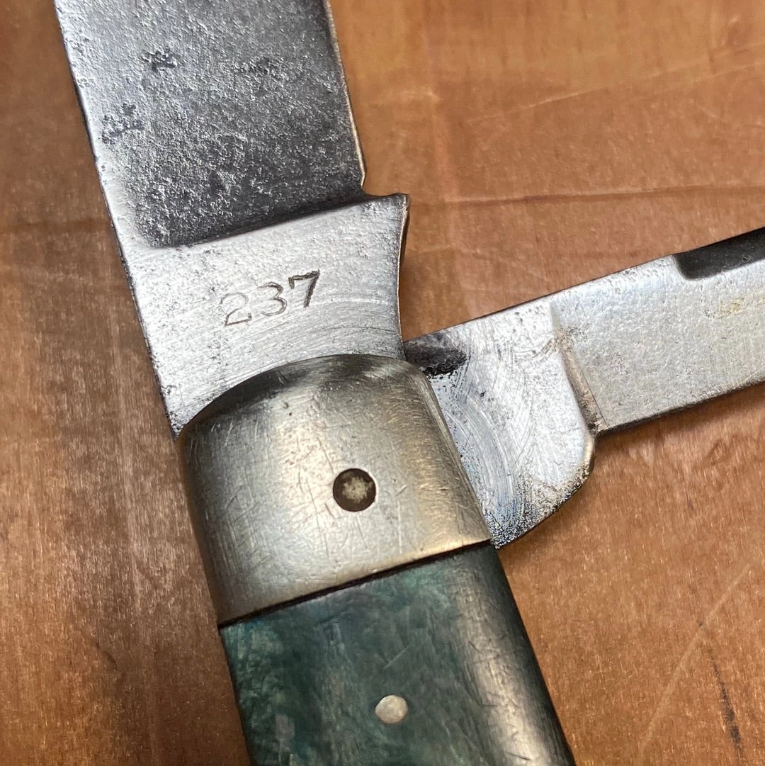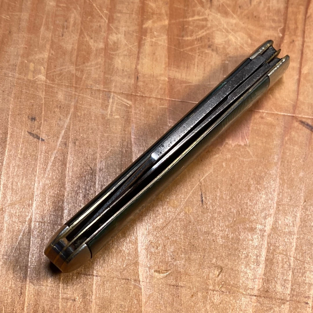 NY Knife Co Walden 1856-1931 3.5” jack knife with green Pyralin handle scales, main blade has a nice snap but the smaller pen blade is lazy (no snap) and has a little bend.