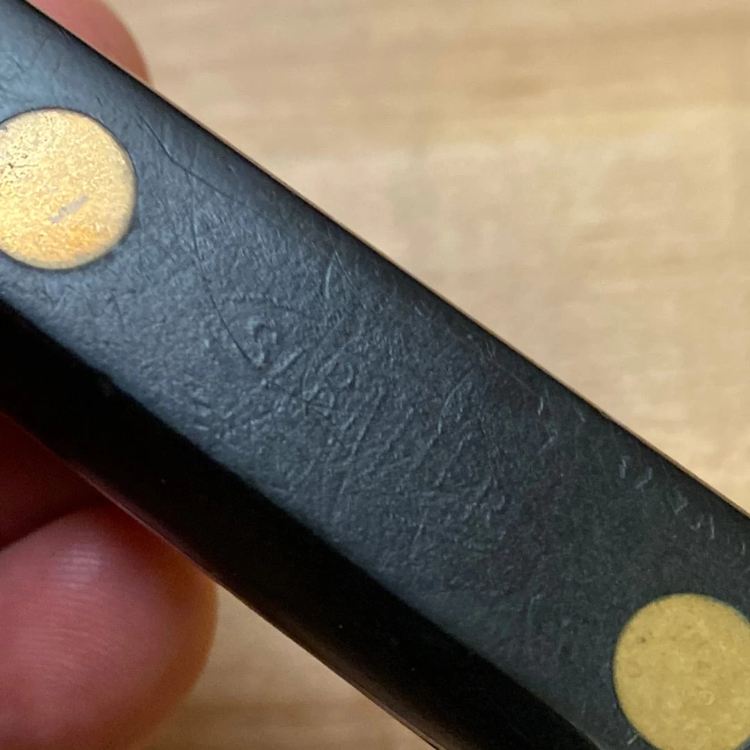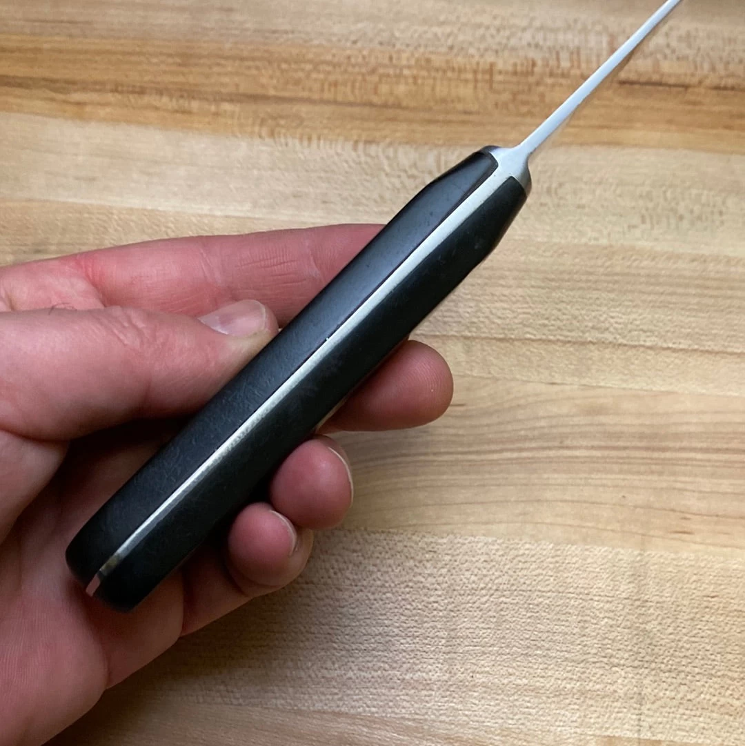 Hand forged after drop forged and hand ground 7.75” stainless steel slicer with POM handle and brass rivets.