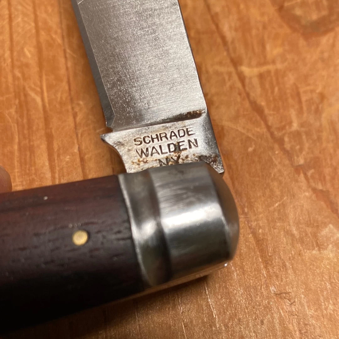 4.5” closed Schrade Walden sailors / rope knife with Walkaid advertising shield. This marking of Schrade knives dates it to 1946 to 1973 manufacture but the style of grinding on blade and bolsters suggests early manufacture.