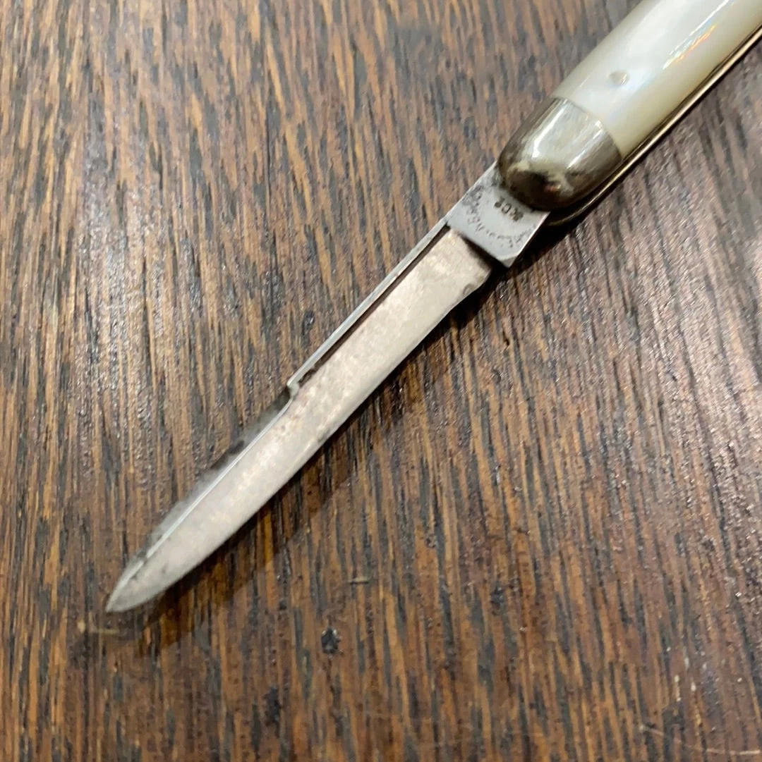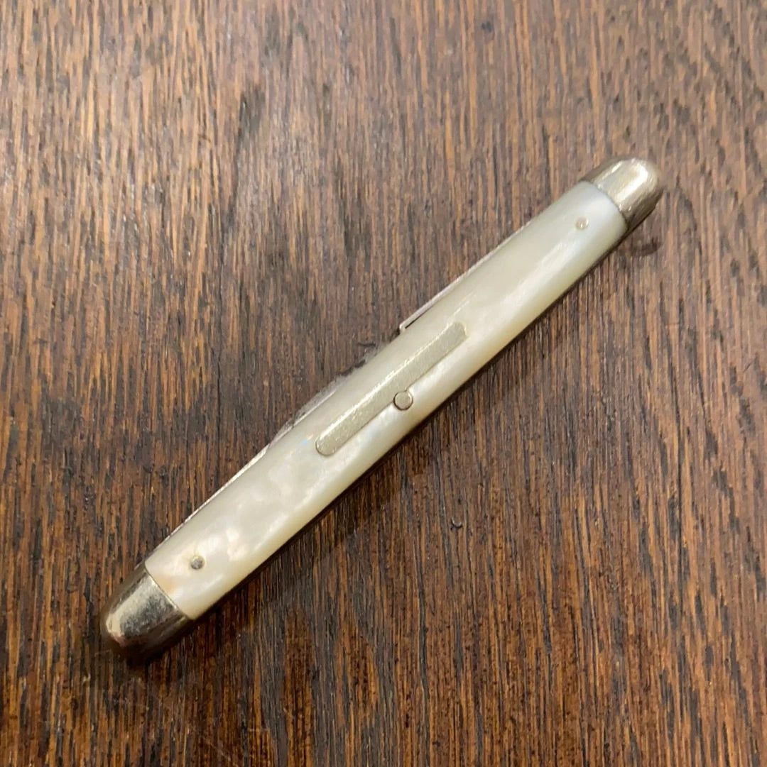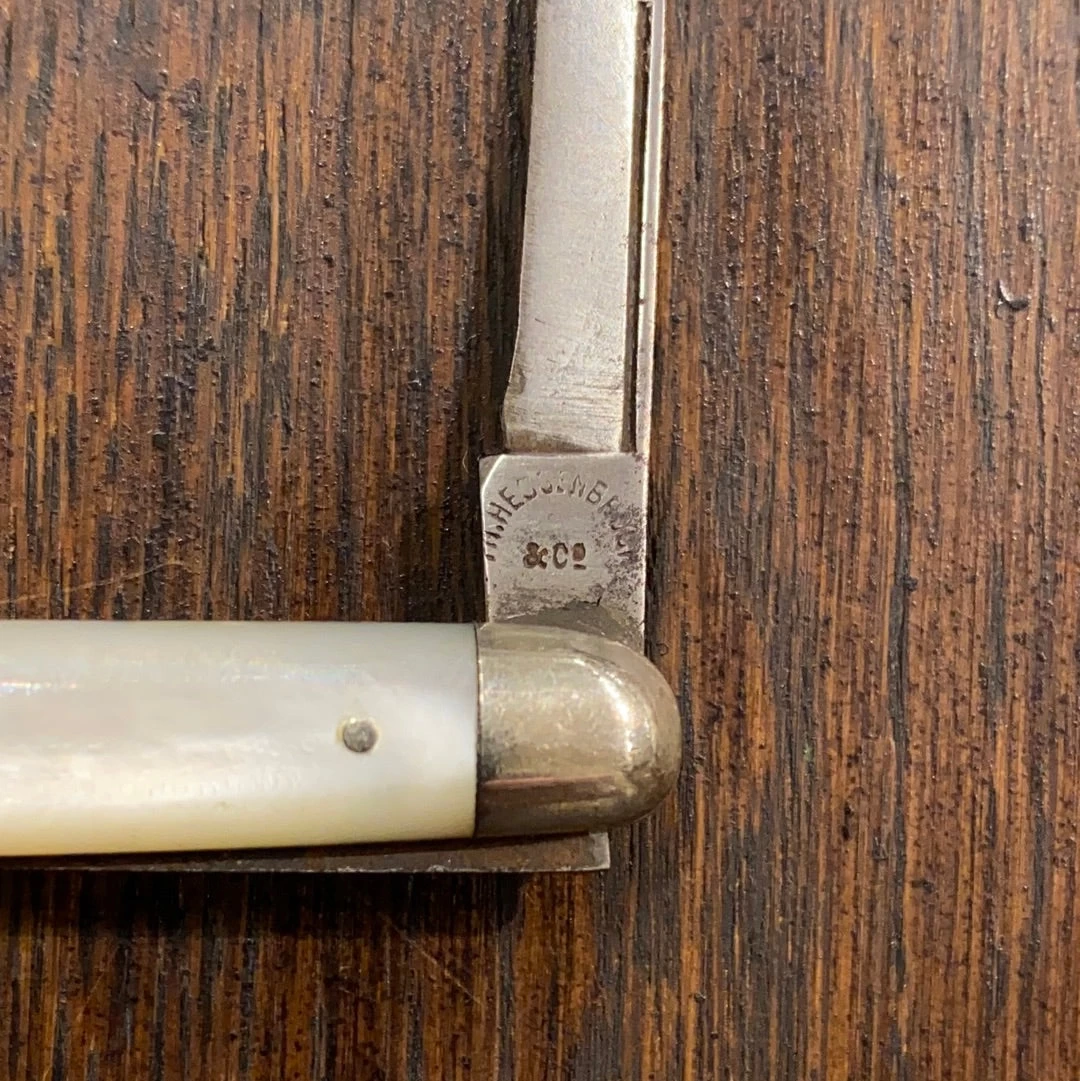Antique T Hessenbruch pearl handled pen knife, this marking was used between 1873-1906. Carbon steel blades, mother of pearl hafts and nickel bolsters and milled liners.