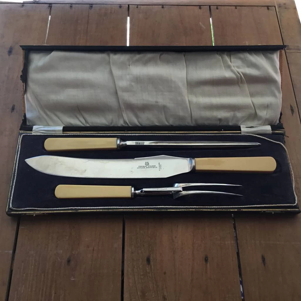 Stainless steel was not an immediate success as early versions didn’t perform very well. Supposedly Brearley was also credited for inventing a knife that would not cut… Brearley left the Brown-Firth Research Laboratory in Sheffield in the 1920’s and this set likely dates from around that time.
