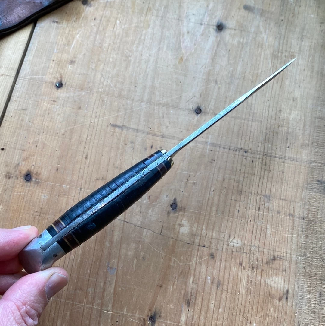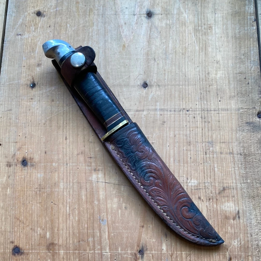 Western 4.25” ‘bird and trout’ knife made in the 1950’s or 60’s with carbon steel blade, stacked leather handle with vulcanized rubber spacers and aluminum pommel and leather sheath.
