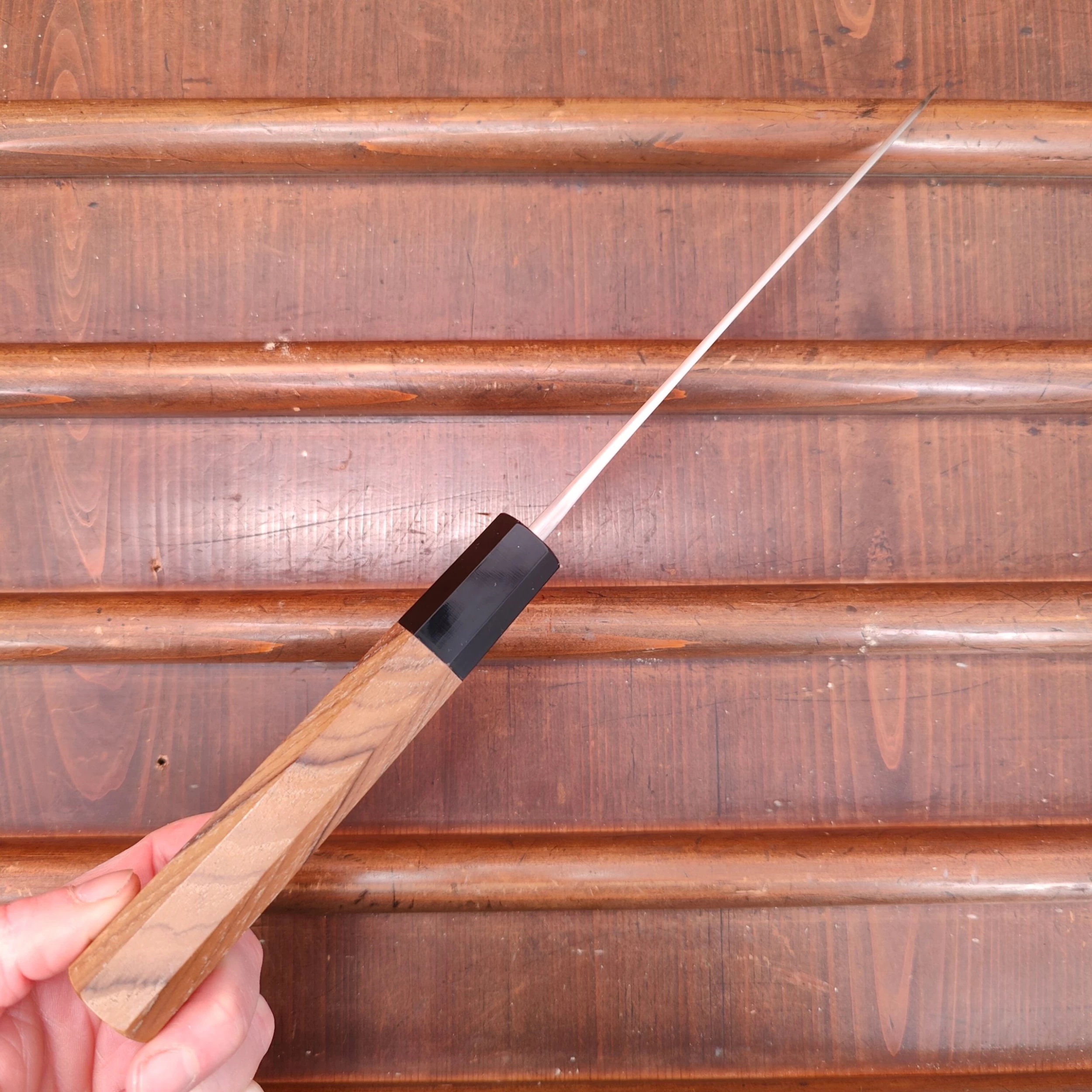 Yoshikane’s hand forged shirogami 2 carbon steel core with stainless nashiji finished stainless cladding and octagonal teak handle with horn ferrule.