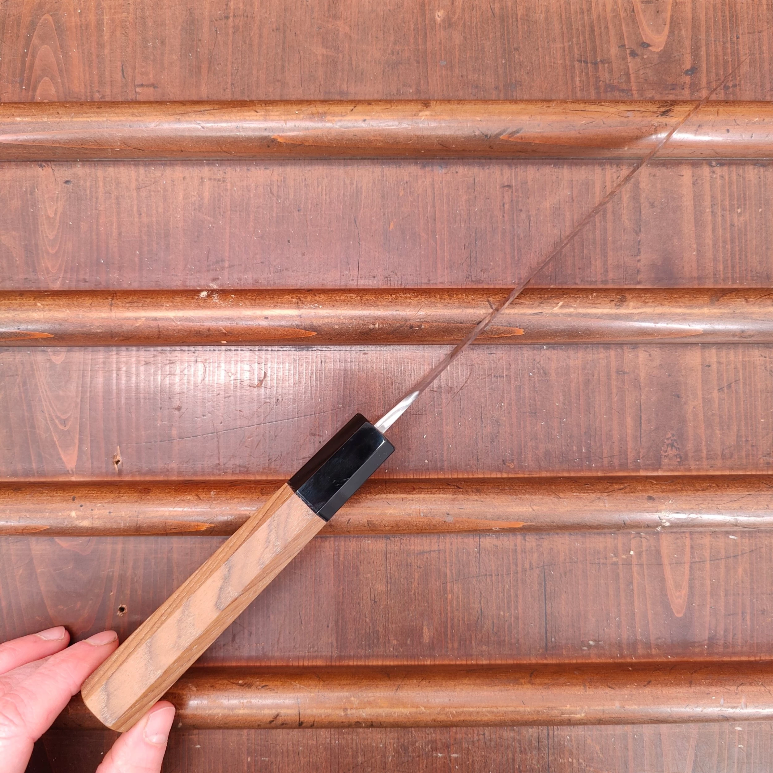 Hardened to 64 HRC, these knives hold a keen edge for a long time, owing to thier excellent heat treatment and despite this hardness they have a good degree of toughness and are very very easy to sharpen. Being ground with a wide, kiriba primary bevel, they also allow for easy thinning down the road, especially as Yoshikane kireba grinds are especially flat.