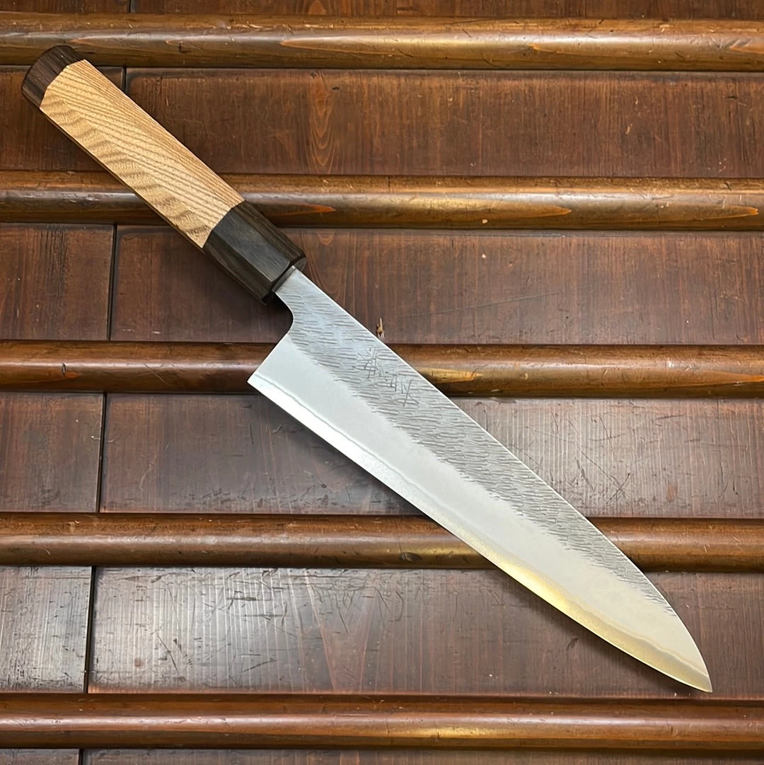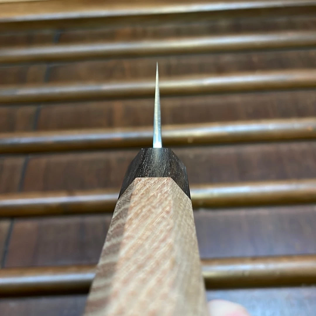 Yoshikane’s hand forged stainless clad shirogami 2 carbon steel with Yoshikane original pattern hammermarked finished with octagonal enju wood with double ebony ferrule handle. This is an unusual pattern of hammer mark;