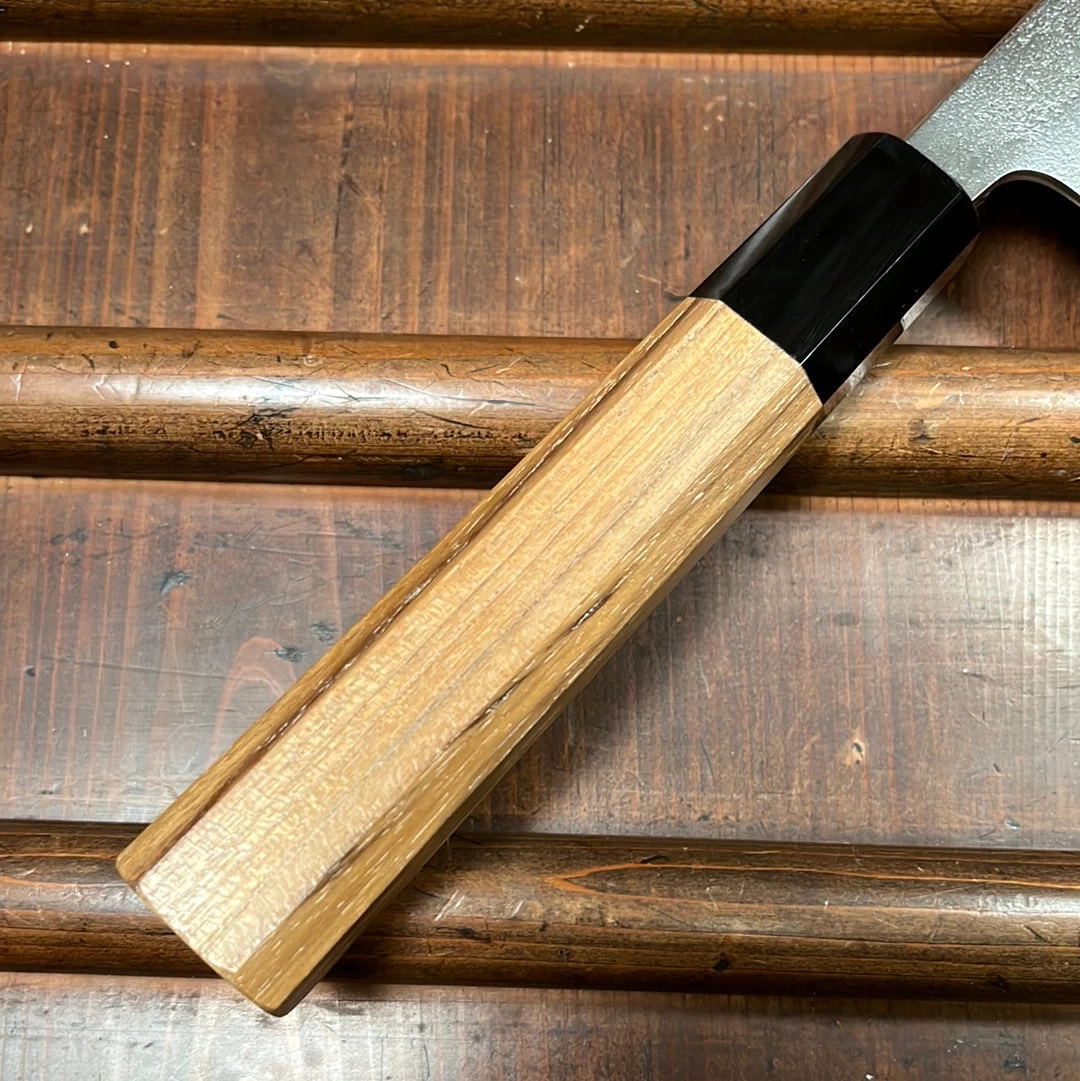 Yoshikane’s hand forged shirogami 2 carbon steel core with nashiji finished stainless cladding and octagonal teak handle with horn ferrule.