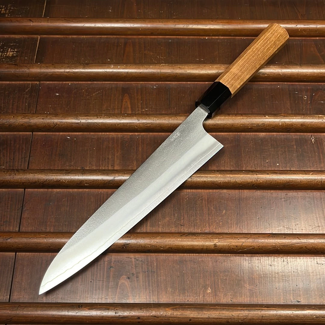 Yoshikane’s hand forged SKD semi-stainless core with nashiji finished stainless cladding and octagonal teak handle with horn ferrule.